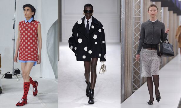 첫번째는 일명 땡땡이 무늬로 불리는 ‘도트 패턴’이에요. 레트로 패션에 많이 활용되는 패턴으로 발랄하고 통통 튀는 느낌을 가지고 있죠. 이탈리아 럭셔리 브랜드 마르니는 빨간색, 노란색 등 과감한 컬러 팔레트에 기하학적 형태의 물방울 및 줄무늬 패턴으로 이 느낌을 잘 구현해냈습니다. 보송한 모헤어 소재 니트에 양말과 신발까지 도트 무늬로 통일하는 대담한 룩으로 시선을 사로잡았어요. 반면, 발렌티노와 미우미우는 블랙과 화이트 조합의 도트 패턴으로 클래식한 분위기를 연출했습니다. 오버사이즈 도트 숏코트에 셔츠와 넥타이로 깔끔한 룩을 완성한 발렌티노와 속이 훤히 비치는 도트 스커트에 가디건을 매치한 미우미우는 화려하기는커녕 모던한 매력을 자아냈죠.