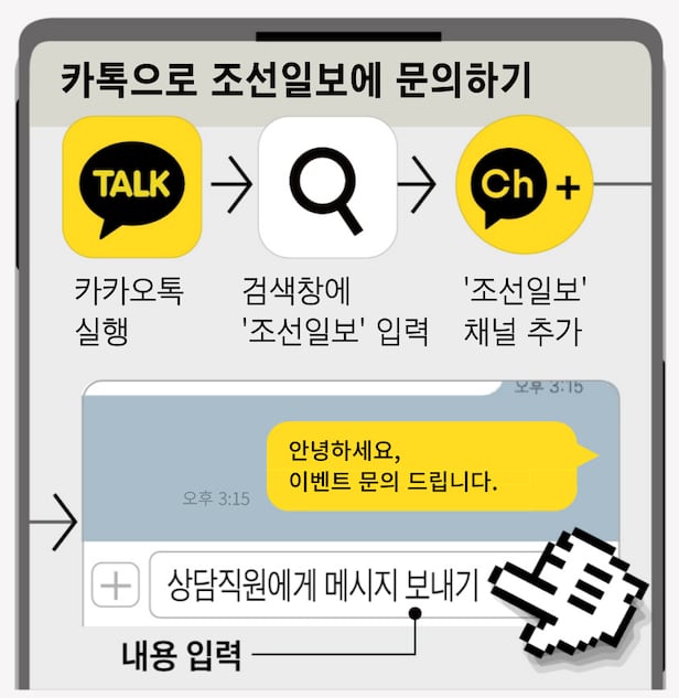좋은 기사 공유하기 이벤트에 관해 카카오톡으로 문의하는 방법은 간단합니다. ①카카오톡 검색창(돋보기 아이콘)에서 ‘조선일보’를 입력한 후 ②’조선일보’ 채널을 추가해 상담 직원에게 좋은 기사 공유 이벤트에 관해 문의 사항을 보내시면 순차적으로 답변해드립니다. 좋은 기사 공유하기 이벤트 이외 상담은 제한될 수 있습니다. 상담 운영시간은 월요일부터 금요일까지인 평일 오전 9시부터 오후 5시까지입니다. 그 외에 시간에는 답변이 늦어질 수 있습니다.