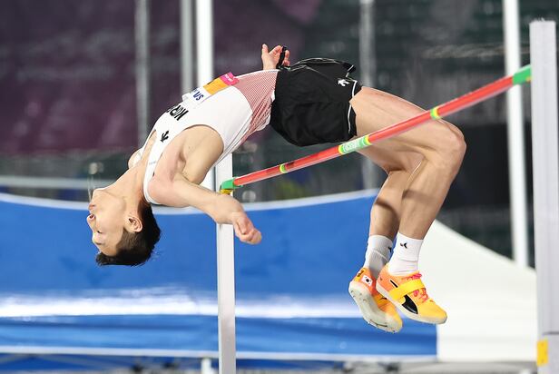 우상혁은 7일 오전(한국 시간) 이탈리아 로마에서 열린 대회 남자 높이뛰기 경기에서 2m32를 넘고 정상에 올랐다.