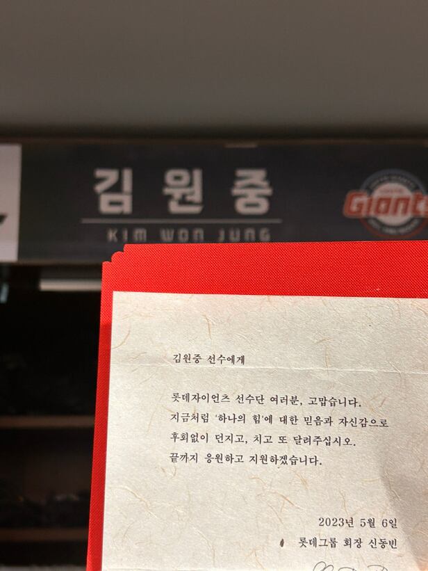 격려품과 함께 '롯데 자이언츠 선수단 여러분, 고맙습니다. 지금처럼 '하나의 힘'에 대한 믿음과 자신감으로 후회없이 던지고, 치고 또 달려주십시오. 끝까지 응원하고 지원하겠습니다'라는 글이 담긴 감사 카드가 신동빈 롯데 그룹 회장 명의로 동봉됐다.