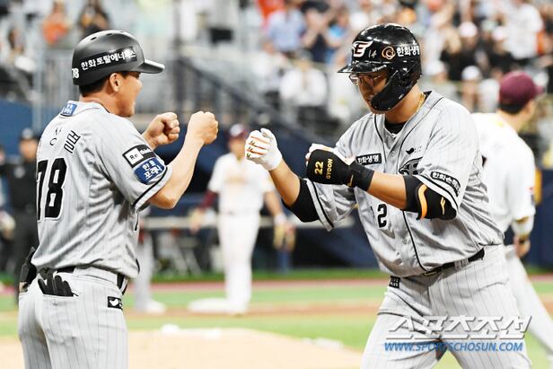 선두타자 5번 문현빈이 중전안타로 포문을 열었다. 연속 볼넷으로 이어진 1사 만루. 한화 벤치가 승부수를 띄웠다. 9번 이도윤 타석에 대타 하주석을 내보냈다. 1군 합류 후 두 번째 타석에 선 하주석이 좌전 적시타를 때렸다.