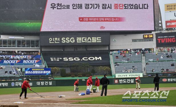 결국 경기 2분만에 심판진이 우천 중단을 선언했다. 첫번째 중단은 오래 가지 않았다. 오후 2시 15분 비가 완전히 그치지는 않았지만, 빗줄기가 약해지면서 심판진이 SSG 야수들에게 다시 경기를 준비할 것을 요청했다. 그리고 약 16분 후인 2시 18분 경기가 재개됐다.