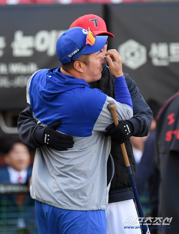 두 사람은 말보다 먼저 포옹을 나눴다. 오랜 시간 함께했던 시간들이 떠올랐던 걸까. 손승락 수석코치 품에 안긴 최형우는 잠시 생각에 잠겼다. 말로 설명하기 힘든 감정이 순간 올라온 듯 얼굴을 연신 쓸어내렸다.