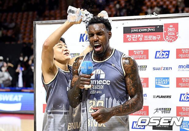 라건아의 11,000득점 기록이 세워진 순간 팀 동료들과 사직체육관을 가득 메운 팬들의 축하가 이어졌다.