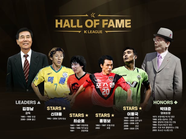 최순호(61), 홍명보(54), 신태용(53), 이동국(44), 김정남(80) 감독과 故 박태준 포스코 명예회장이 K리그 명예의 전당에 초대 헌액됐다.