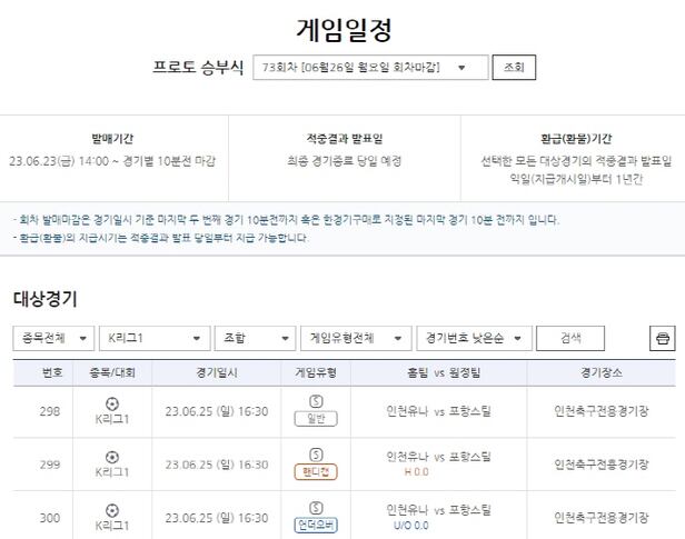 프로토 승부식 73회차 중 인천-포항전을 대상으로 하는 한경기구매 게임은 23일 오후 2시부터 구매가 가능하며, ▶298번(일반) ▶299번(핸디캡) ▶300번(언더오버)의 각기 다른 세 가지 방식으로 게임을 즐길 수 있다.