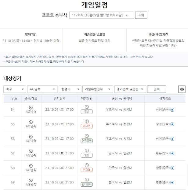 6일 오후 2시부터 발매를 개시하는 프로토 승부식 117회차 중 한국(홈)-일본(원정)전을 대상으로 하는 한 경기 구매 게임은 ▶57번(일반) ▶58번(핸디캡) ▶59번(언더오버)의 각기 다른 세 가지방식으로 게임 참여가 가능하며, 경기 시작 10분 전인 7일 오후 8시50분까지 구매가 가능하다.
