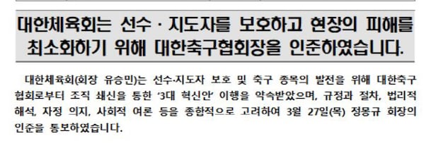 '대한체육회는 선수와 지도자의 권익 보호는 물론, 국민적 관심이 높은 축구 종목의 저변확대와 발전을 위해 ▶규정과 절차 ▶법리적 해석 ▶축구협회의 높은 자정의지 ▶국민적 여론 등을 종합적으로 고려해 대한축구협회의 혁신 이행을 전제로 이번 인준을 최종 통보했다'면서 '다만, 향후 법원의 결정 등에 따라 변동될 가능성이 있음을 알려드린다'고 덧붙였다. '앞으로도 대한체육회는 모든 회원종목단체를 대상으로 제도적 보완 조치 요구와 철저한 관리·감독을 지속해 나가며, 선수와 지도자의 존엄과 권리를 보장하고 자유롭고 공정한 스포츠 환경을 조성하기 위해 노력할 것을 약속드린다'고 밝혔다.