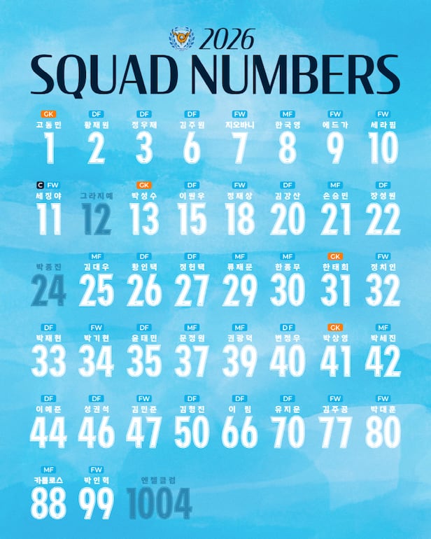 이번 시즌 대구 유니폼을 처음 입게 된 새 얼굴들도 자신만의 번호를 선택했다. K리그를 대표하는 미드필더 한국영은 중원의 중심을 의미하는 8번을 달고 출격한다. 박인혁은 강렬한 에너지를 드러내는 99번을 택했다. 김대우(25번), 황인택(26번)도 새로운 등번호로 팀에 빠르게 녹아들며 새 출발을 준비 중이다.