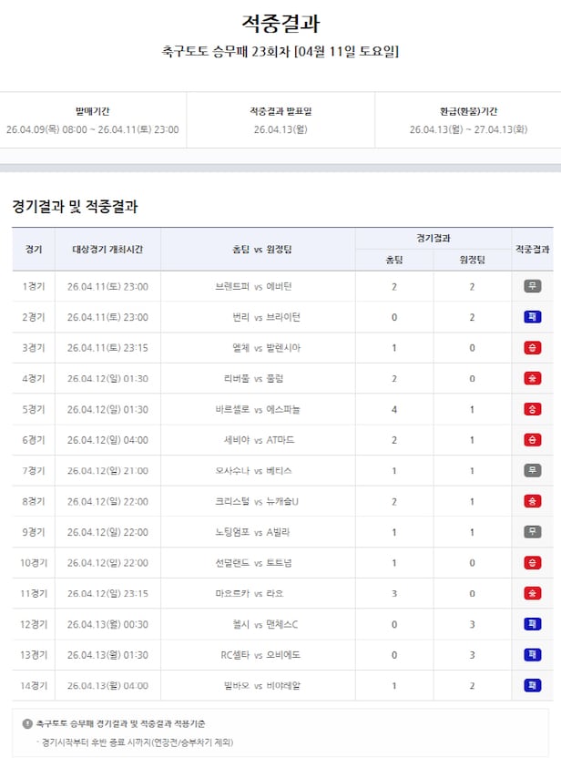 서울올림픽기념국민체육진흥공단(이사장 하형주)이 발행하는 체육진흥투표권 스포츠토토의 수탁사업자 한국스포츠레저㈜가 11일부터 13일까지 진행된 잉글랜드프리미어리그(EPL) 및 스페인 라리가 등 14경기를 대상으로 한 축구토토 승무패 23회차의 적중결과를 발표했다.