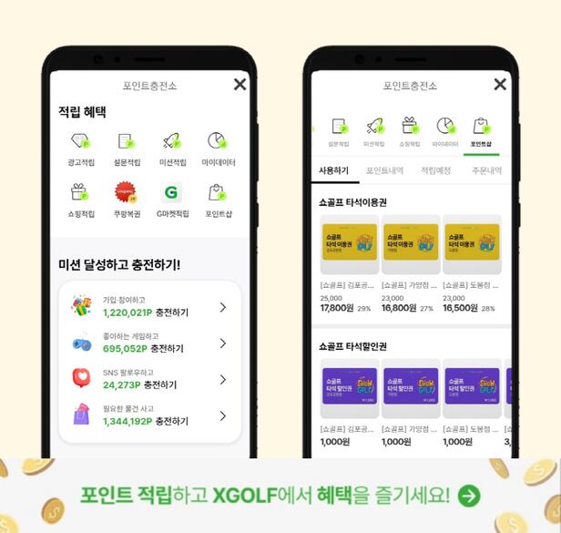 이번 시스템은 앱 내에서 일정 광고를 보면 각종 포인트를 보상 받을 수 있는 형태. XGOLF앱 내 포인트 충전소 페이지를 들어가면 광고적립, 미션적립, 설문적립 등 활동을 통해 포인트를 획득할 수 있다. 적립된 포인트는 XGOLF 그린피 할인권, 쇼골프 연습장 이용권 등 쇼골프 상품 구매를 포함해 카페, 편의점, 백화점, 외식, 영화, 도서 등 약 1300여개 브랜드 상품을 포인트로 구매할 수 있다.