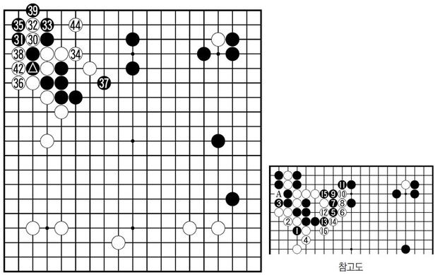 참고도 16까지가 카타고의 수순. 이 변화도의 핵심은 사석(捨石) 작전이다. 돌 몇 점 버리고 선수로 바깥을 싸바른다는 것. 이것이라면 외곽을 철벽으로 만든 백의 대성공이다. 하지만 실전 심리상으로도, 발상의 차원에서도 참고도 6 같은 수를 떠올릴 수 있는 인간 고수는 거의 없다. 카타고는 너무도 당연해 보이는 44에 대해서도 시비(?)를 걸고 나섰는데…. (40 43…30, 41…32)