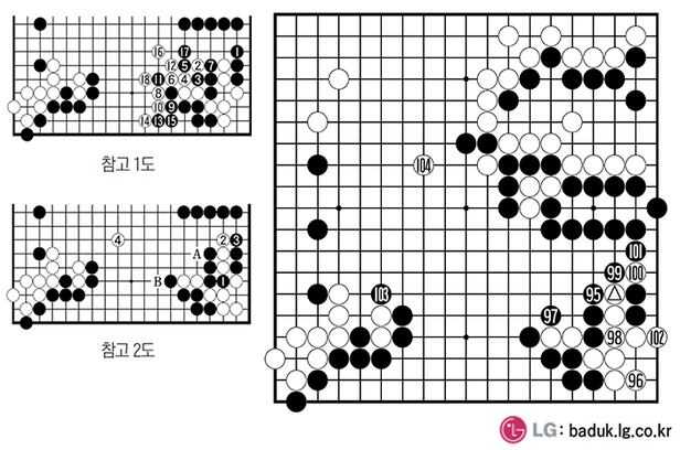 △가 전보 마지막 수. 참고 1도를 보자. 귀의 백을 계속 추궁하려면 1이 필수다. 백이 2로 씌워오면 7까지 외길 진행 후 백 8, 10로 압박해 수상전 형태가 된다. 흑이 15까지 수를 늘렸을 때 16의 마늘모가 묘수. 18까지 흑이 우하 백을 잡았지만 하변 흑진을 성공적으로 깬 백의 성공이다. 95로 늦춘 이유다.