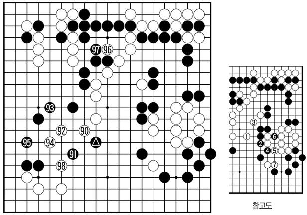 98로 참고도 1이면 흑 2 때 3에 두어 중앙 백이 사는 것은 어렵지 않다. 우변 백도 7까지 타개할 수 있다. 하지만 이처럼 근근이 목숨만 구하는 식의 진행은 커제의 기질엔 맞지 않는다. 기세와 주도권을 중시하는 게 그의 기풍이다. 과연 검토실의 예상대로 커제는 98로 역차단을 시도하며 하중앙 흑 2점(91과 ▲)을 공격 대상으로 설정한다. 돌연 풍운이 급박해지고 있다.