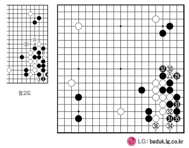 34는 어땠을까. 35를 강요하고 36으로 빠져 자체적으론 훌륭한 자세를 갖췄다. 다만 한 가지 아쉬운 것은 후수라는 점. 우하귀를 선수로 안정한 흑이 먼저 37로 준동한 수가 위협적이었다. 대안으로 제시된 수가 참고도 1로 끊는 맥점. 그랬으면 4까지 넘음을 방지한 뒤 먼저 5로 손을 돌릴 수 있었다(흑이 당장 A로 움직이는 것은 백 B~D의 수순으로 잘 안 된다). 백이 급해졌다.