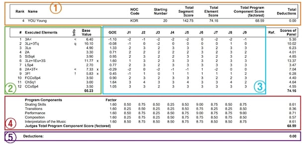 1번을 살펴보면 선수의 순위와 이름, 소속국가, 연기 순서 등이 차례로 적혀있다. 이어 최종 합계 점수(Total Segment Score), 기술점수(TES·Total Element Score), 예술점수(PCS·Total Program Component Score), 감점(Total Deductions)이 나열돼 있다.