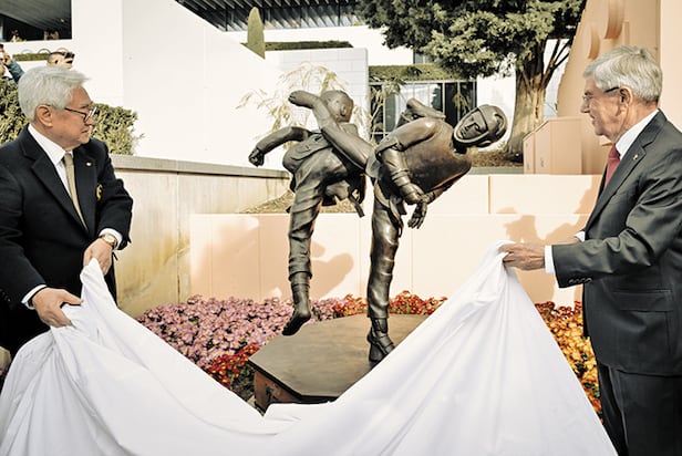 조정원(왼쪽) 세계태권도연맹 총재와 토마스 바흐 IOC(국제올림픽위원회) 위원장이 15일 스위스 로잔 올림픽 박물관에서 열린 제막식에 참석해 태권도 동상을 공개하고 있다. 올림픽 박물관에 조형물을 설치한 정식 종목은 태권도가 10번째로, 근대 올림픽 역사에 큰 의미를 가지거나 IOC가 올림픽 핵심 파트너로 인정한 종목들이다.