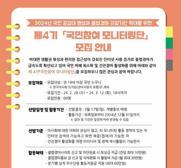 이에 한국마사회는 온라인 불법경마 확산을 저지하기 위해 2021년부터 ‘불법경마 단속 국민참여 모니터링단’을 운영해오고 있다. 국민참여 모니터링단은 지난 3년간 총 9,619건의 온라인 불법 경마 단속 실적을 기록하며 불법도박 확산 방지에 기여해왔다. 오는 6월 온라인 마권발매의 본격적인 시행을 앞둔 한국마사회는 건전한 온라인 경마문화의 조성을 위해 ‘제4기 국민참여 모니터링단’을 모집한다.