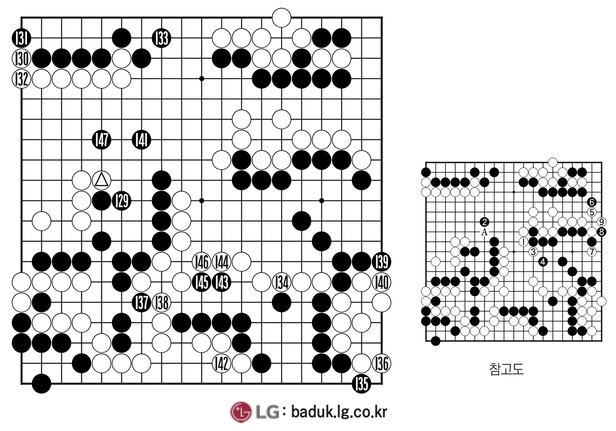 팽팽한 접전이 끝없이 이어지고 있다. 백이 △에서부터 132까지 선수 끝내기를 해치운다. 134도 큰 자리. 하지만 인공지능(AI)은 그냥 넘어가지 않고 참고도를 제시했다. 우선 1로 위아래 백돌을 연결한 뒤 2가 불가피할 때 우변 7~9로 상대 약점을 추궁하라는 것. 백으로선 A의 붙임 등 팻감도 많아 솔깃해지는 그림이다.