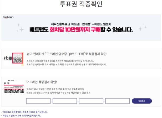 스포츠토토를 오프라인에서 구매한 고객은 공식 홈페이지의 ‘투표권 적중 확인 페이지’에 고유번호 15자리를 입력해 결과를 확인할 수 있다. 또한 투표권 상단 우측에 인쇄된 QR코드를 스마트폰으로 스캔하면, 별도의 로그인이나 정보 입력 없이도 즉시 적중 여부를 조회할 수 있는 ‘QR코드 조회 서비스’도 제공되고 있다.