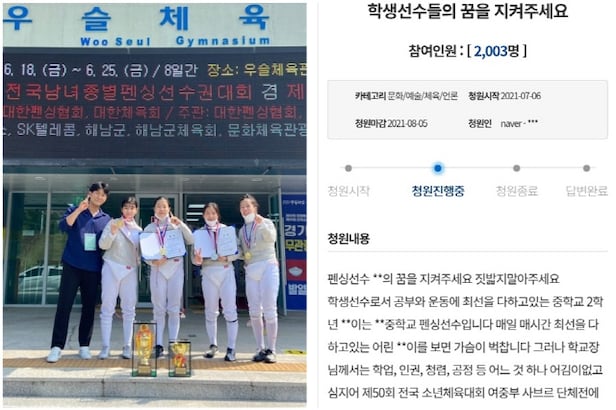 청원 직후 '펜싱소녀들'의 꿈을 지켜내자는 현장 체육인들의 참여와 관심이 뜨겁다. 단톡방으로 해당 청원을 퍼나르며 서명에 동참하고 있다. 이틀만에 2000명 이상이 동의와 공감의 뜻을 표했다.