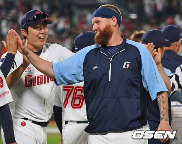 롯데 자이언츠 스트레일리가 KIA 타이거즈에 14-2로 대승하고 배영수 코치와 기쁨을 나누고 있다. 2023.06.02 / foto0307@osen.co.kr