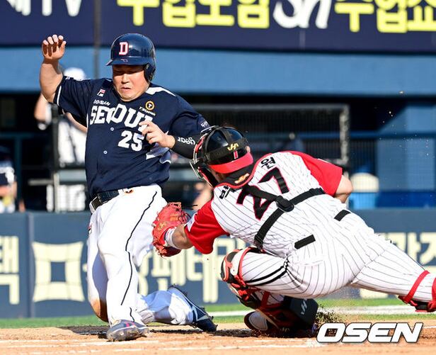 2회초 2사 2루 상황 두산 박계범의 추격의 1타점 적시타 때 주자 양의지가 홈 쇄도해 LG 포수 박동원의 태그 보다 앞서 세이프 되고 있다. 2023.06.18 / dreamer@osen.co.kr