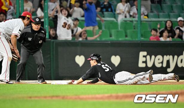 8회초 무사 주자 2루 LG 홍창기가 중견수 오른쪽 동점 1타점 적시 3루타를 날린 후 3루에 몸을 날려 세이프 되고 있다. 2023.06.28 / rumi@osen.co.kr