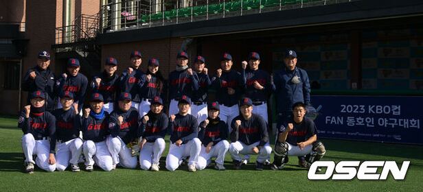 경기를 앞두고 롯데(롱비치) 선수단과 롯데 은퇴선수 윤학길-강성우가 포즈를 취하고 있다. 2023.11.18 /cej@osen.co.kr