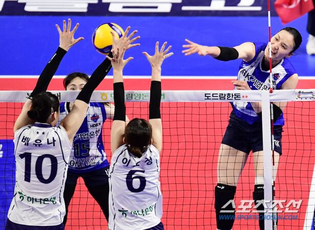 9일 화성 실내체육관에서 배구 V리그 여자부 IBK기업은행과 한국도로공사의 경기가 열렸다. IBK기업은행 표승주가 도로공사 블로킹을 앞에 두고 스파이크를 날리고 있다. 화성=송정헌 기자songs@sportschosun.com/2024.01.09/