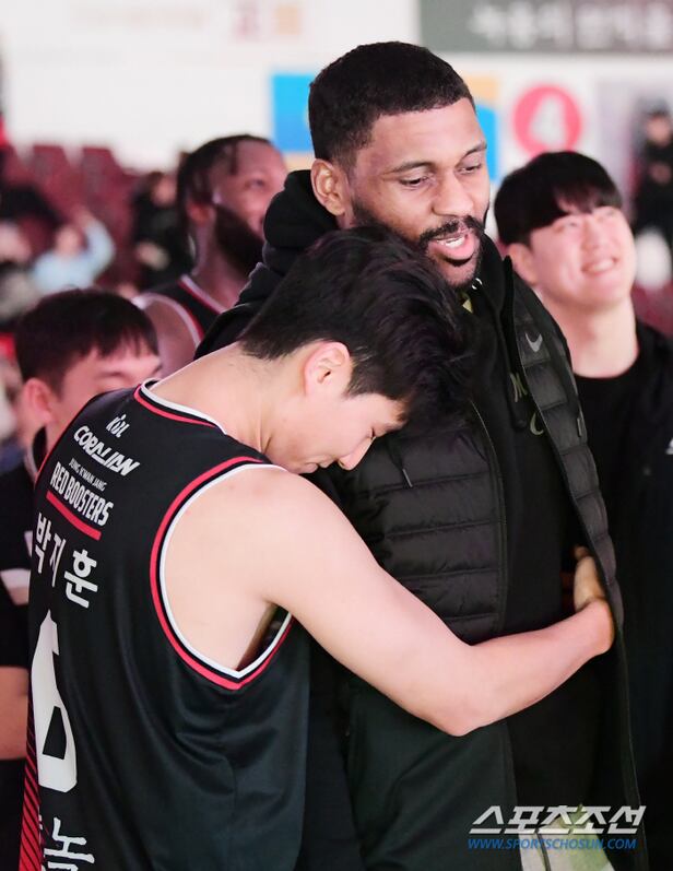 19일 안양체육관에서 열린 안양 정관장과 서울 삼성의 경기가 끝난 후 데릴 먼로가 정관장 팬들과 작별 인사를 했다. 먼로는 부상이 악화돼 팀을 떠나게 됐다. 박지훈이 먼로를 껴안고 있다. 안양=정재근 기자 cjg@sportschosun.com/2024.1.19/