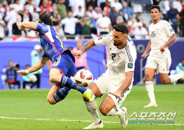 19일(현지시간) 카타르 도하 에듀케이션 시티 스타디움에서 열린 2023 아시아축구연맹(AFC) 카타르 아시안컵 이라크와 일본의 경기. 일본 아사노가 페널티박스 안쪽에서 이라크 술라카 태클에 걸려 넘어지고 있다. 알라이얀(카타르)=박재만 기자 pjm@sportschosun.com/2023.01.19/