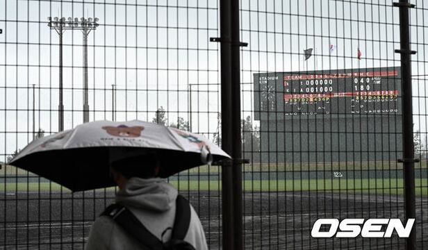 7회초 시작을 앞두고 갑작스런 폭우에 연습경기가 중단됐다. /cej@osen.co.kr