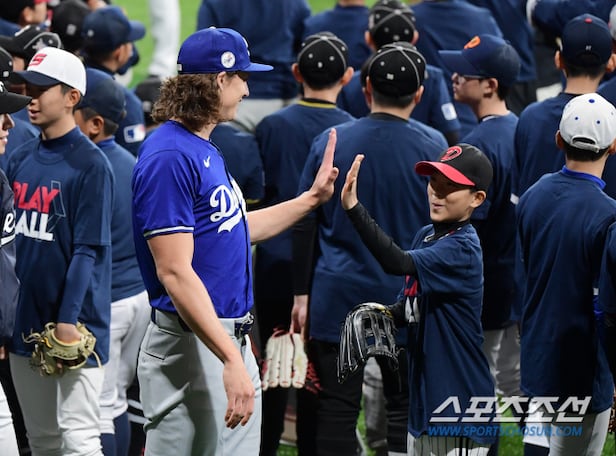 미국프로야구(MLB) 월드투어 서울시리즈가 열리는 서울 고척스카이돔. 16일 오후 팀 코리아 원태인과 LA 다저스 타일러 글래스노우가 유소년 클리닉에 참여했다. 글래스노우가 어린이들과 손을 잡고 있다. 고척=정재근 기자 cjg@sportschosun.com/2024.3.16/