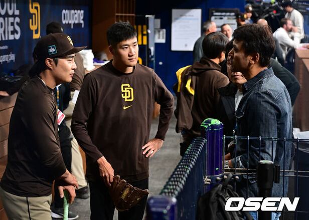 한국인 최초 메이저리그 선수로 다저스와 샌디에이고에서 투수로 활약한 박찬호가 샌디에이고 김하성과 인사를 나누고 있다. 2024.03.18 /jpnews@osen.co.kr