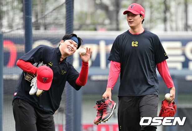 훈련을 마친 최지민과 정해영이 장난을 치고 있다. 2024.03.24 / cej@osen.co.kr