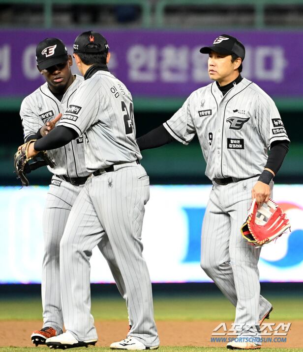 26일 인천SSG랜더스필드에서 열린 한화와 SSG의 경기, 한화가 6대0으로 승리했다. 경기 종료 후 기쁨을 나누는 한화 김강민 임종찬 페라자의 모습. 인천=허상욱 기자wook@sportschosun.com/2024.03.26/