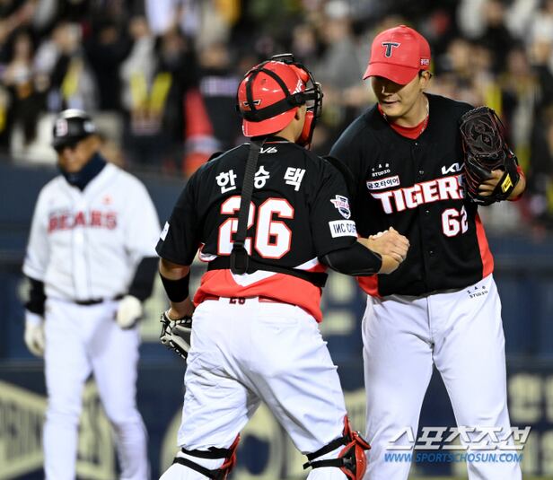 29일 잠실야구장에서 열린 KIA와 두산의 경기, KIA가 4대2로 승리하며 개막 4연승을 달렸다. 경기 종료 후 기쁨을 나누는 정해영 한승택 배터리의 모습. 잠실=허상욱 기자wook@sportschosun.com/2024.03.29/