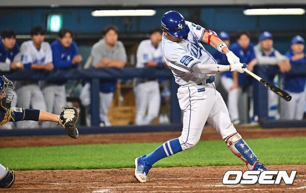 삼성 라이온즈 강민호가 8회말 2사 1,2루 중견수 오른쪽에 떨어지는 1타점 적시타를 치고 있다. 강민호는 이 안타로 2000안타(19번째) 기록을 달성했다. 2024.04.12 / foto0307@osen.co.kr