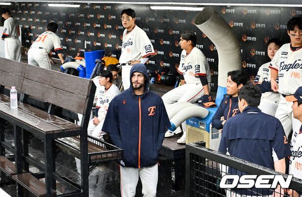 한화 와이스, 채은성을 비롯한 선수들이 덕아웃에서 내리는 빗방울을 바라보고 있다. 2025.09.28 / rumi@osen.co.kr