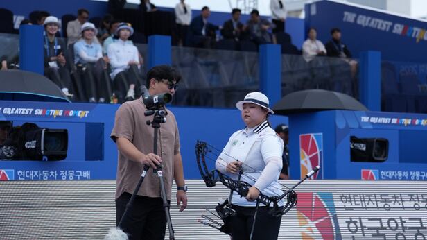 2일 광주 국제양궁장과 5·18 민주광장에서 현대자동차 정몽구배 한국양궁대회 2025 이틀 째 일정이 진행됐다. 김수연이 경기 도중 코치와 이야기를 나누고 있다. 사진제공=대한양궁협회