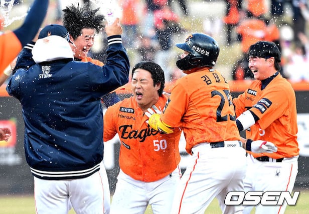연장 11회말 2사 2루 상황 한화 강백호가 끝내기 안타를 날린 뒤 동료들의 물세례를 받고 있다. 2025.03.28 / dreamer@osen.co.kr