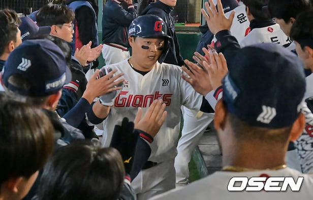 롯데 자이언츠 한동희가 9회말 2사 1루 손호영의 좌중간 1타점 2루타때 득점을 올리고 하이파이브를 하고 있다. 2026.04.07 / foto0307@osen.co.kr