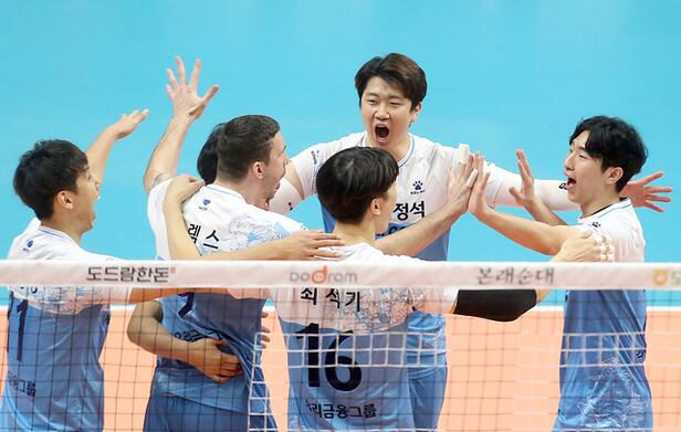 먼저 웃은 팀은 OK금융그룹이었다. 1세트 24-23에서 조재성이 나경복의 시간차를 기다렸다가 블로킹으로 처리, 팀에 첫 세트를 선사했다.