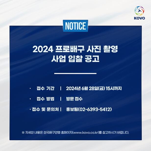 한국배구연맹(KOVO)은 문화체육관광부와 국민체육진흥공단이 지원하는 2024 프로배구 사진 촬영 사업을 행할 업체를 모집한다.