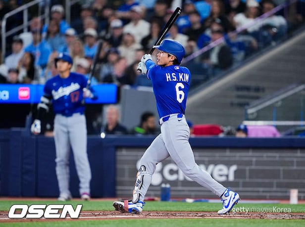 김혜성은 첫 타석이던 3회초. 선두타자로 나서 토론토 선발 케빈 가우스먼의 2구째 시속 92.5마일의 포심 패스트볼을 공략해 우중간을 가르는 2루타를 때렸다.