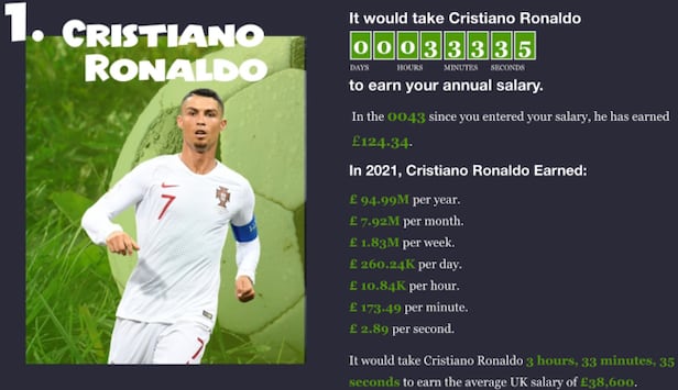이 사이트는 자신의 연봉을 넣으면 각 축구스타들이 얼마나 빨리 자신의 연봉을 받게 되는지 알 수 있도록 했다.