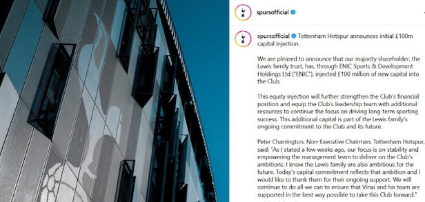토트넘은 9일(이하 한국시각) '우리 클럽의 최대 주주인 루이스 패밀리 트러스트가 ENIC를 통해 1억파운드의 신규 자본을 클럽에 투자하기로 했다'고 발표했다. 그리고 '이번 자본 투자는 클럽의 재정 상태를 더욱 강화하고, 클럽 경영진이 장기적인 스포츠 성공에 집중할 수 있도록 추가적인 자원을 확보하는 데 도움이 될 것이다. 이 추가 자본은 루이스 가문이 클럽과 클럽의 미래를 위해 지속적으로 기울이는 헌신의 일환'이라고 강조했다.