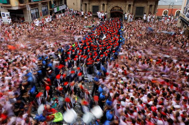 7월 6일 스페인 팜플로나 타운홀 광장에서 열린 2022 산 페르민 축제의 개막식 모습입니다. 빨간 모자를 쓴 고적대가 북을 두드리며 등장하자 광장에 모인 사람들이 두팔을 흔들고 있는 모습을 슬로우 셔터로 찍어서 시끌벅적한 축제의 분위기를 잘 살린 사진입니다. 지난 2년간 코로나 팬데믹으로 인해 중단되었던 산 페르민 축제는 개막식인 추피나소를 시작으로 9일간 그 유명한 소몰이와, 공연, 퍼레이드 등 다양한 행사가 펼쳐진다고 합니다.