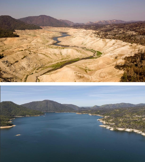 극심한 가뭄으로 바닥이 드러날 정도로 말랐던 캘리포니아 오로빌 호수가 지난 겨울 동안 계속된 폭우와 겨울 폭풍 덕에 본 모습을 찾아가고 있다고 외신이 보도했습니다. AFP통신은 최근 가뭄으로 바닥이 드러났던 2021년 9월 사진과 2023년 4월 사진을 비교하는 여러 장의 사진을 보도했습니다. 2021년 9월 물이 말라 흉칙한 맨 땅을 드러냈던 호수가 2023년 4월 16일 찍은 사진에선 거짓말 같이 수위를 회복해 제 모습을 찾았습니다. 2021년 말라버린 호수 웅덩이에 안타깝게 얹혀 꼼짝 못하던 보트들은 2023년 4월 불어난 호수 위에 떠올라 어디로 든 출항할 태세입니다.